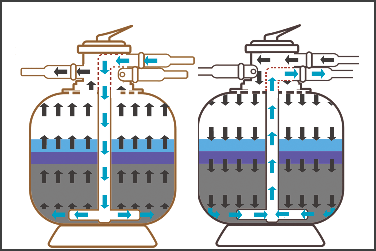 正洗過濾狀態(tài):當(dāng)系統(tǒng)處于過濾狀態(tài)時(shí),未經(jīng)過濾的水通過自行研制獨(dú)特的布水器均勻布水,水以層流狀態(tài)通過濾器內(nèi)的填料層(精制均粒石英砂/石榴石)。當(dāng)水流過填料層時(shí),雜質(zhì)被截留在填料層內(nèi)。過濾器底部有多個(gè)均勻分布的集水器,將過濾后的水均勻地收集并引出,平流過濾,可以使過濾器在高流速下過濾,仍可達(dá)到較好過濾的效果。