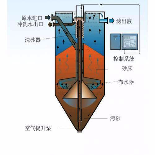 在空壓機(jī)的作用下,空氣提升泵將過濾器底層被污染的臟砂提升至過濾器頂部的洗砂器中,通過水流的紊流作用將砂表面的污染物分離出。清洗后的凈砂利用自重返回到砂床中,而清洗砂所產(chǎn)生的污水從過濾器的排污口排出。