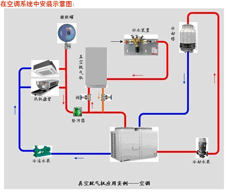 原則上真空脫氣機(jī)可裝于供熱、制冷系統(tǒng)的任何一點(diǎn)上,裝在系統(tǒng)的回水路線上